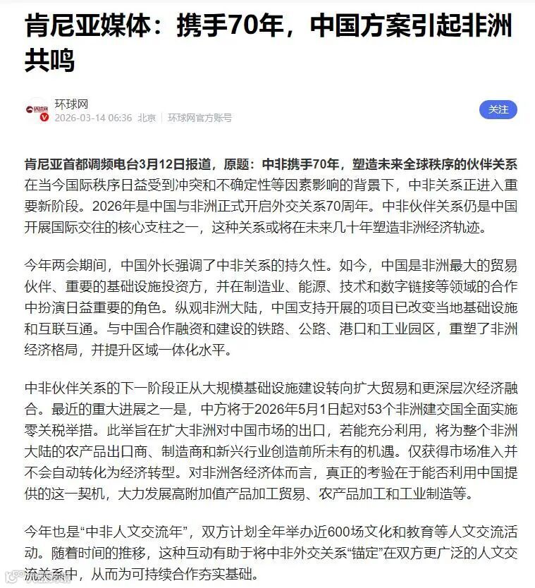 中方在两会期间重申中非关系的稳定性与连续性,进一步增强非洲国家对长期合作的信心。