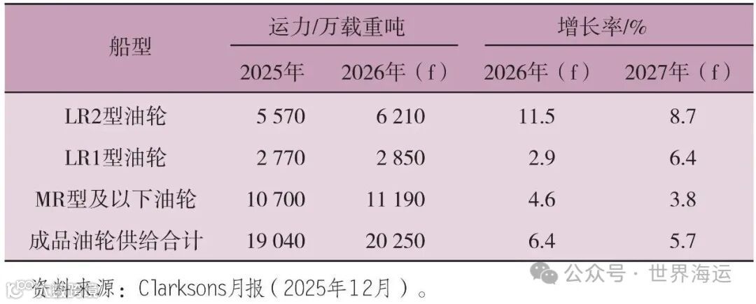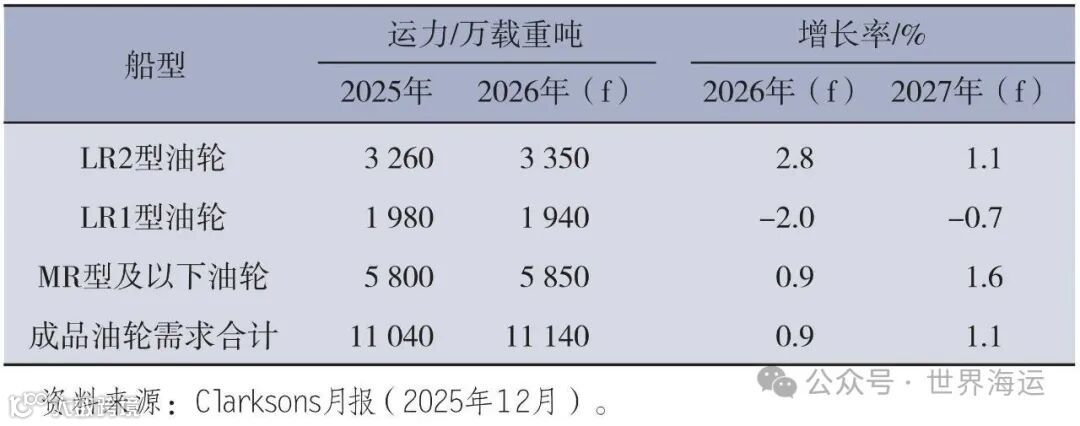 Clarksons预测:2026年成品油轮总需求1.114亿吨(+0.9%),总供给2.025亿吨(+6.4%),过剩9110万吨。LR2、LR1、MR以下船型分别过剩2860、910、5340万吨。