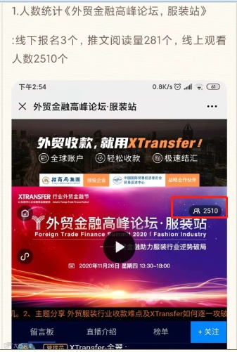 - A.《外贸金融高峰论坛,服装站》:推文阅读281次,直播间线上观看2510人次,线下报名3人;