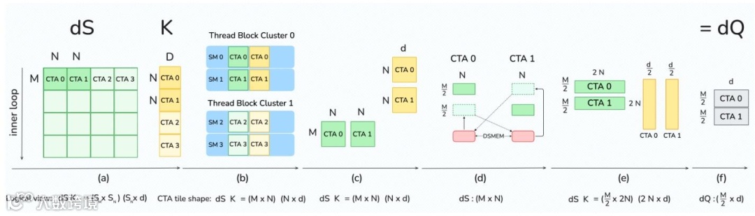 采用2-CTA MMA模式,双计算单元协同完成矩阵乘法,各自仅加载半量数据,使共享内存读写量减半,并减少原子操作,缓解带宽压力。