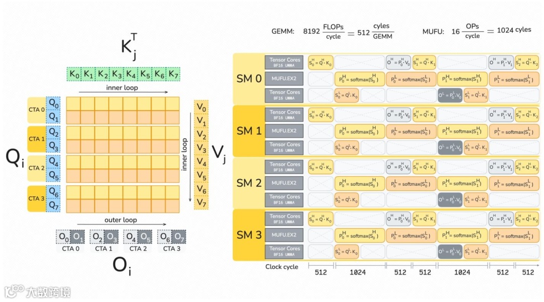 当张量核心处理一个数据块时,其余硬件资源同步执行另一块的softmax计算,消除空闲周期。