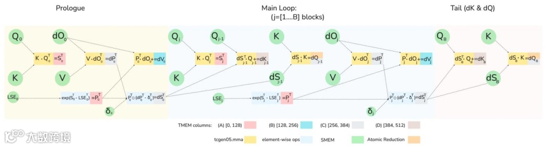 深度适配Blackwell的全异步MMA与新增张量内存(TMEM),重构前向与反向传播流水线,实现softmax计算与矩阵乘法完全重叠。