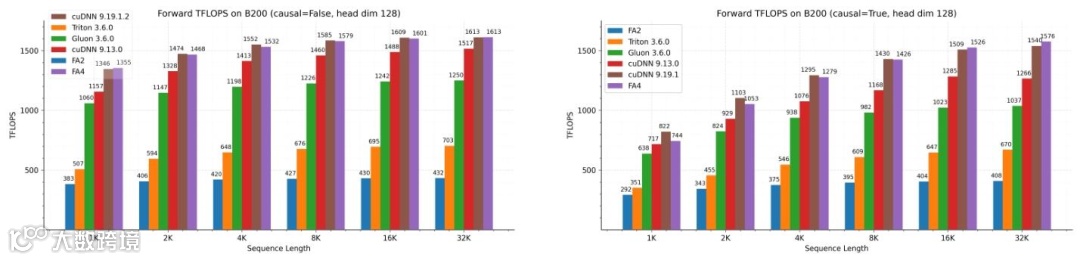 B200实测显示,前向传播峰值达1613 TFLOPS/s,对应71%理论利用率。