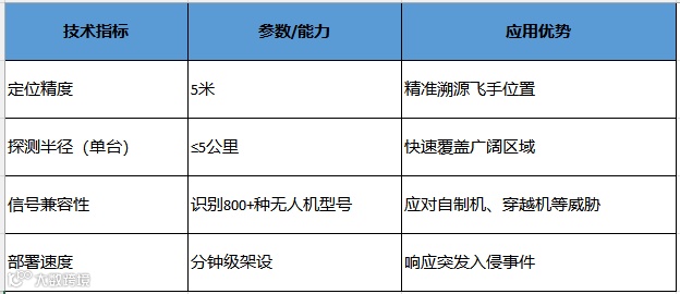 融合TDOA组网与AOA测向,可实现对无人机及飞手的轨迹跟踪与源头定位,构建“侦测—定位—反制”闭环能力。