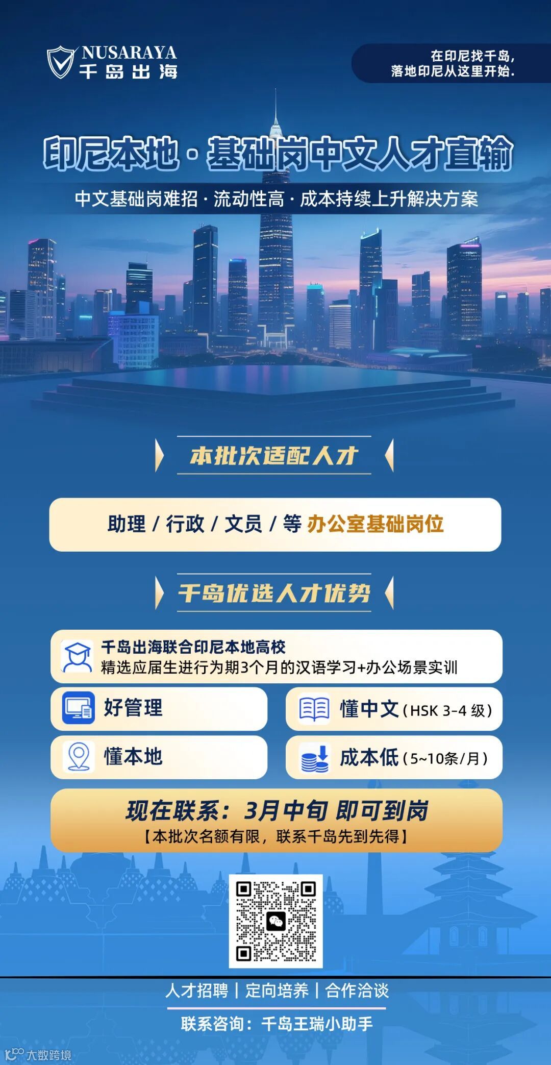 针对上述痛点,千岛出海基于在印尼20年服务经验及3000+中企落地实践,正式推出“印尼本地基础岗中文人才批量定向直输服务”,实现人才从筛选、培训到输送的全流程管控,助力企业降本、提效、稳岗。