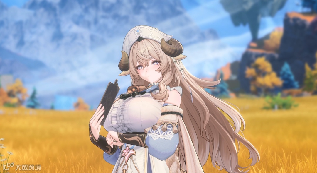 艾妮丝则是典型的羊角少女装扮,有着浅棕渐变的蓬松长发,头顶一对小巧的羊角,搭配白色修女风软帽,温柔又神圣。紧身胸衣勾勒出柔和曲线,外搭层叠蕾丝与精致刺绣的长裙,腰间垂落的流苏与钥匙状挂饰增添了复古感。整体造型既带着清新治愈,又因羊角元素而充满奇幻。