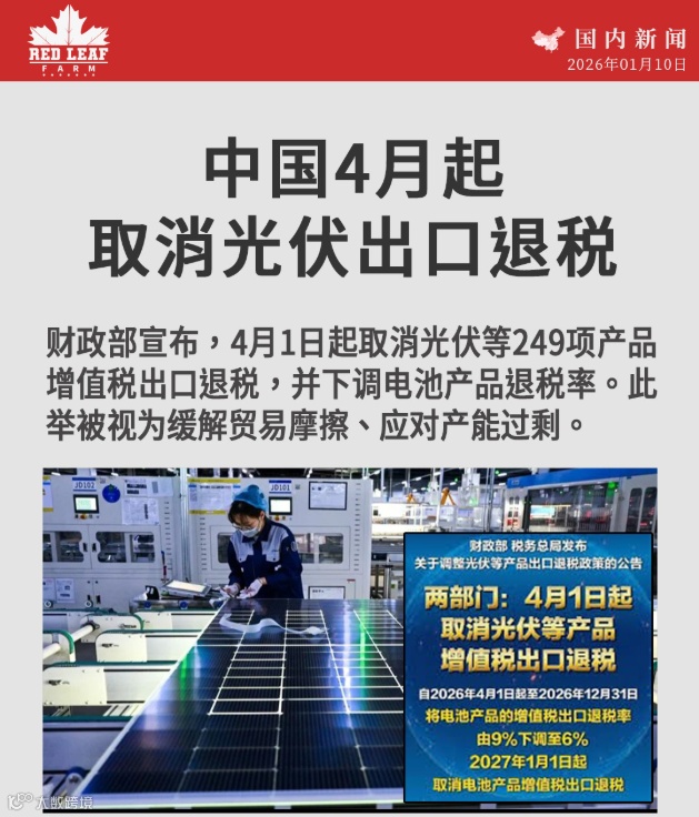 根据财政部1月的公告,自4月1日起,中国将取消249种产品的增值税出口退税,包括光电池、陶瓷制屋顶瓦和六氟磷酸锂。22种电池相关产品(如锂离子电池)的增值税出口退税率由9%下调至6%。