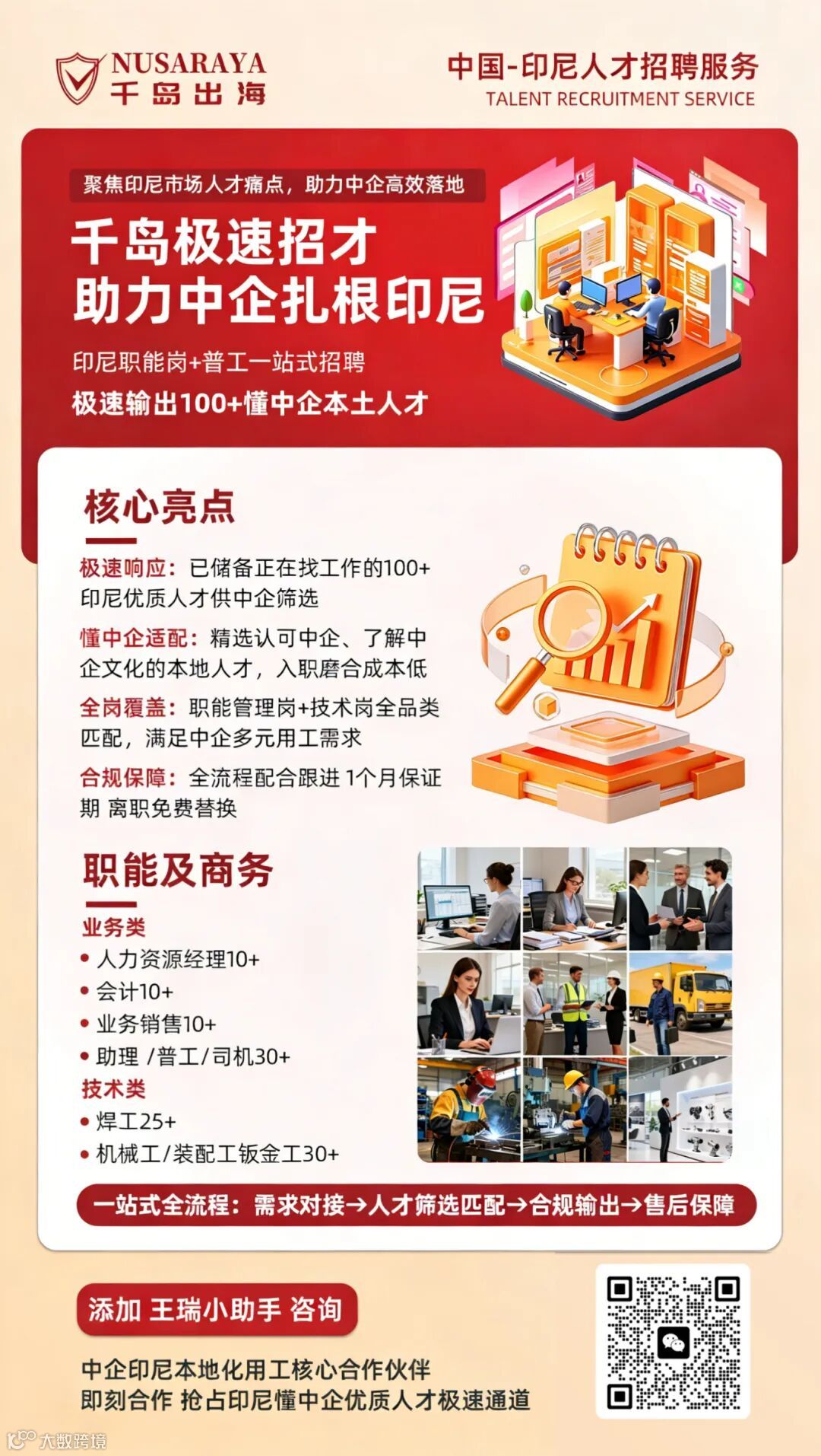 - 极速响应:已储备100+求职中的印尼优质人才,覆盖人力、会计、销售等职能岗及焊工、机械工等技术岗;