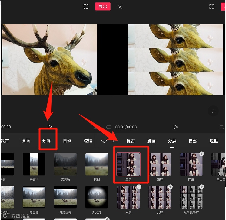 在“特效”菜单中选择“分屏”,即可快速实现双屏、三屏、画中画等多画面组合,丰富构图形式,提升信息密度与视觉趣味性。