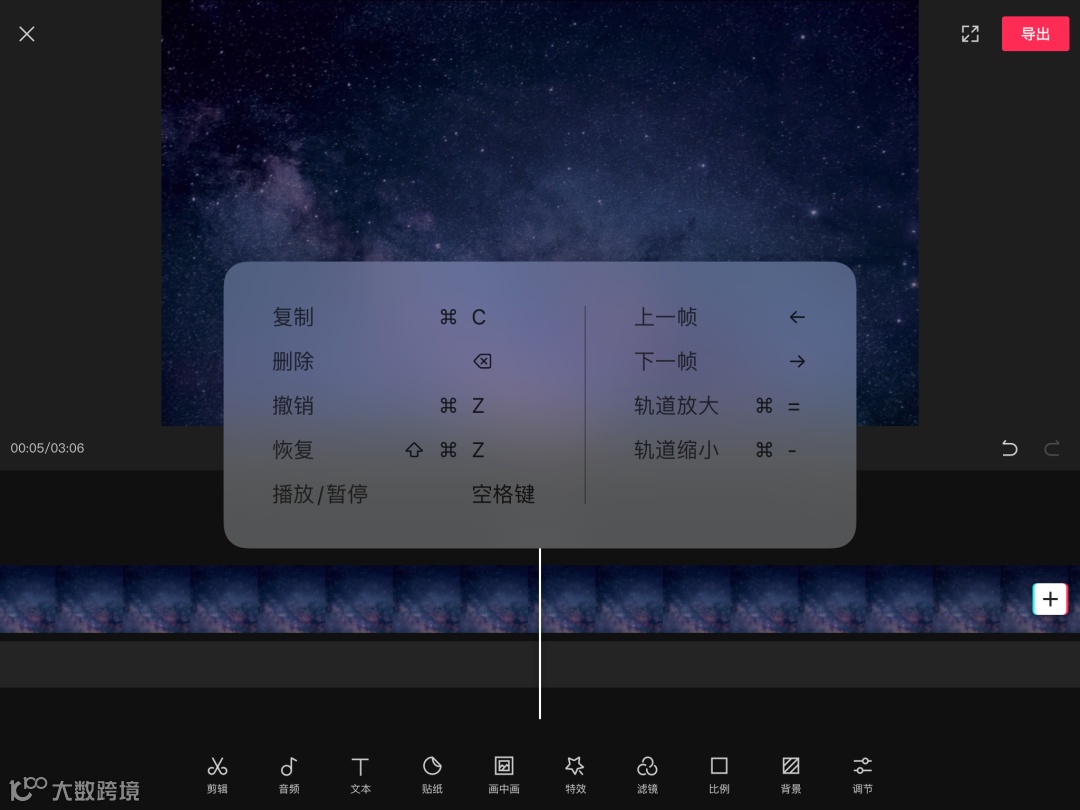 iPad横屏模式下支持键盘快捷键操作,配合更长的时间线显示,进一步提升专业剪辑效率。