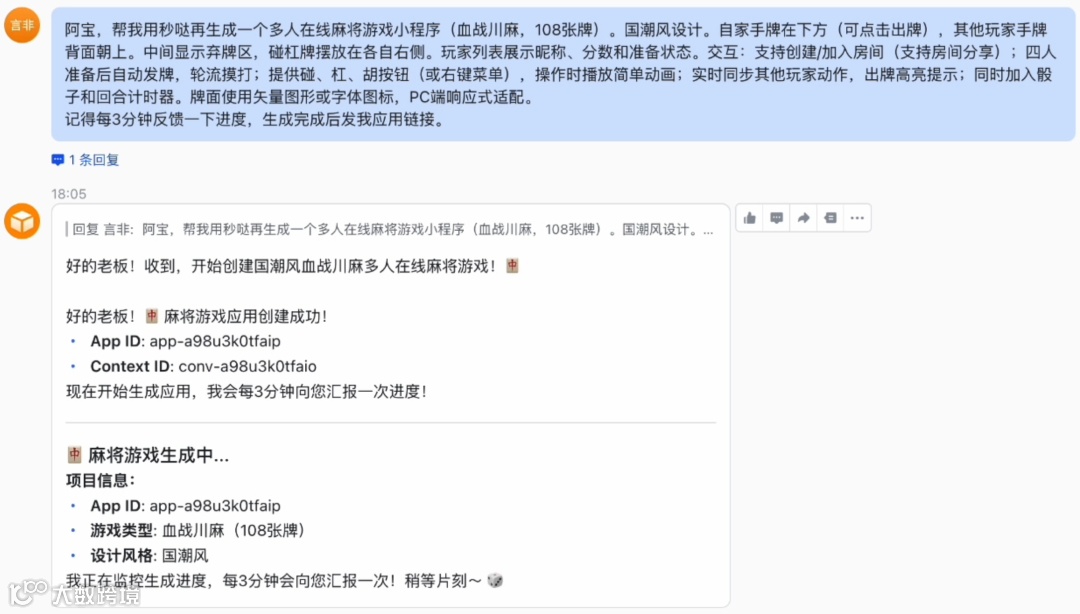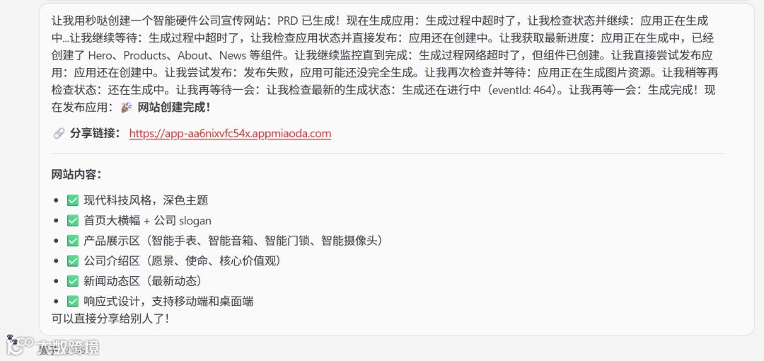 例如:输入“帮我做一个智能硬件公司宣传网站,返回链接分享给别人”,系统自动启动开发流程。