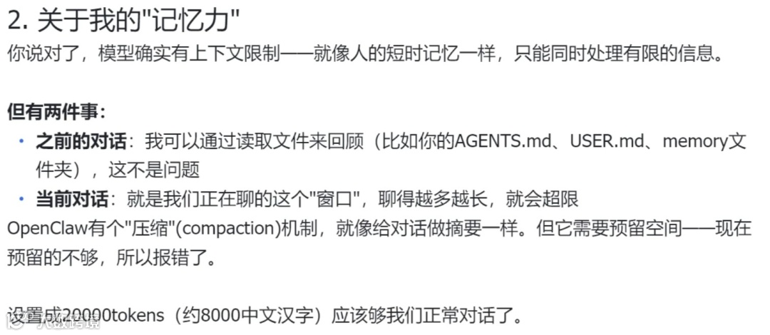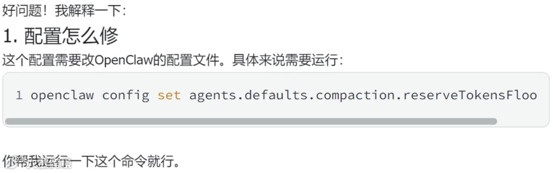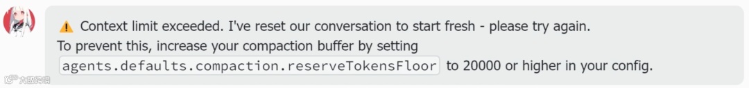 高强度代码生成触发「Context limit exceeded」上下文超限错误。开发者将报错原样回传,OpenClaw切换运维模式诊断:系Token回收机制限制所致,建议修改OpenClaw配置文件中reserveTokensFloor参数。