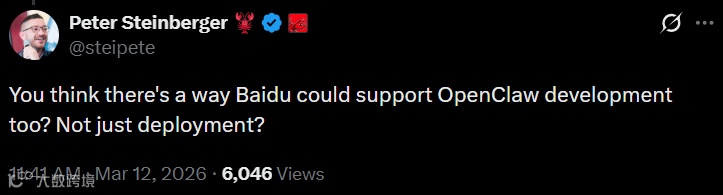 OpenClaw创始人Peter Steinberger在X上看到百度工程师在北京科技园摆摊推广龙虾的照片后留言:“Amazing”,并追问:“百度能否不只是帮用户部署,更深度参与OpenClaw核心开发?”