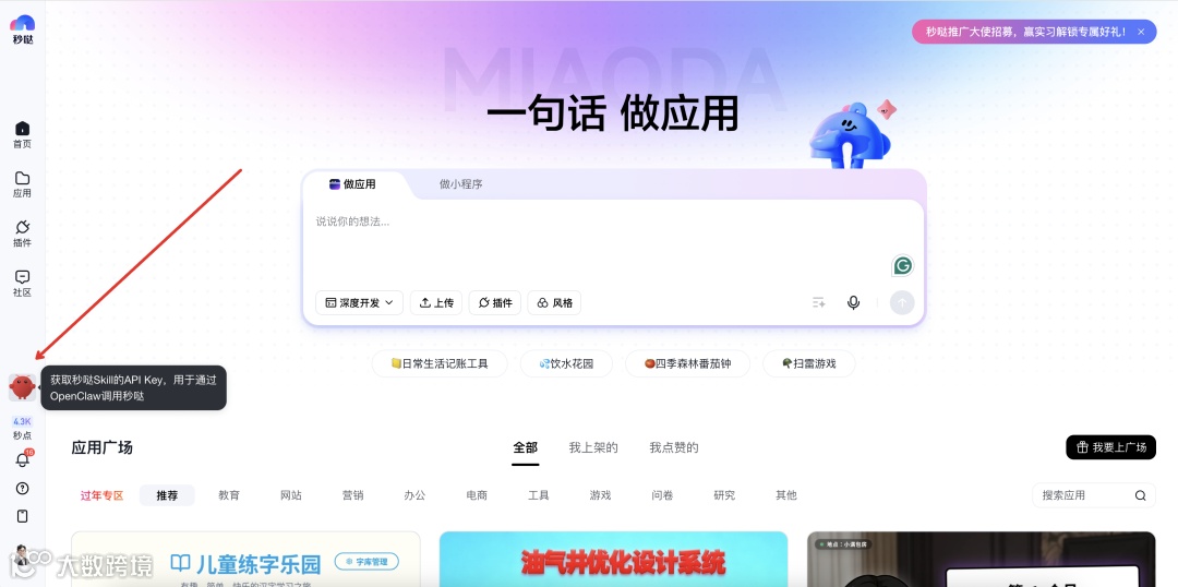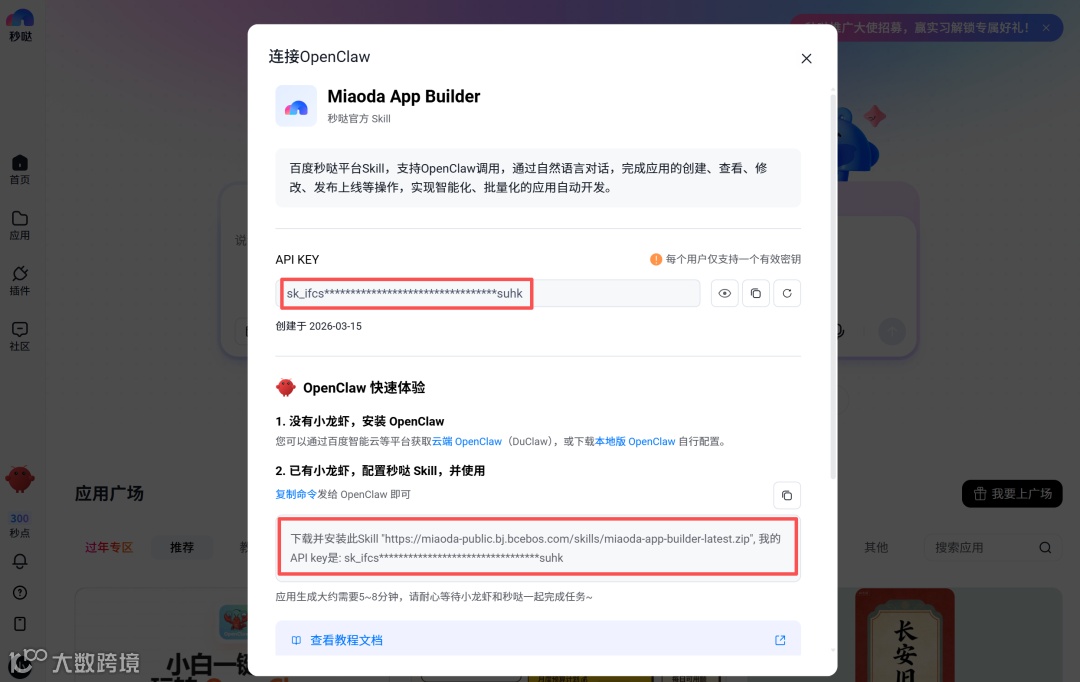 在ClawHub或千帆Skill商店搜索「miaoda-app-builder」下载;或直接将安装指令与API Key粘贴至OpenClaw对话框,系统将自动完成下载、验证与配置,全程不足一分钟。
