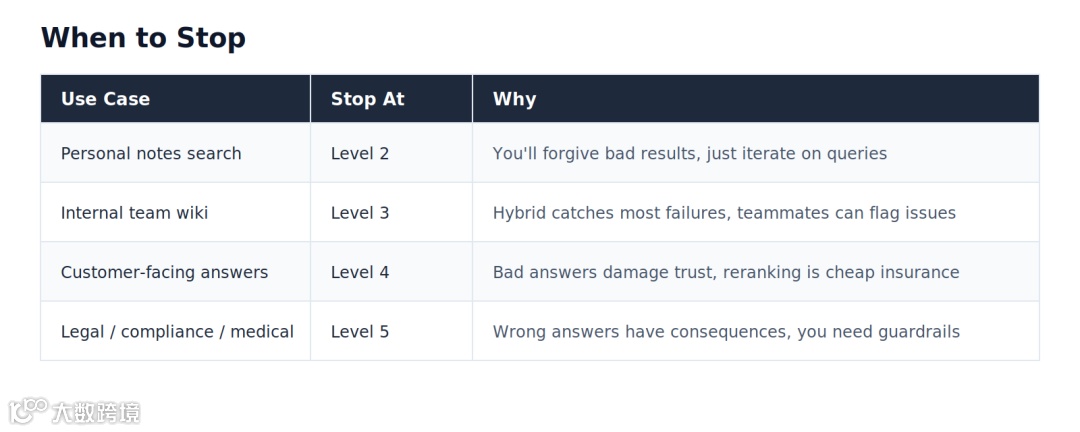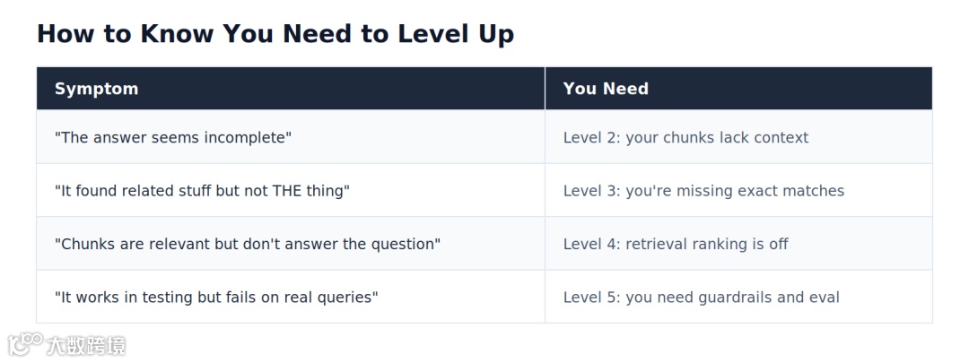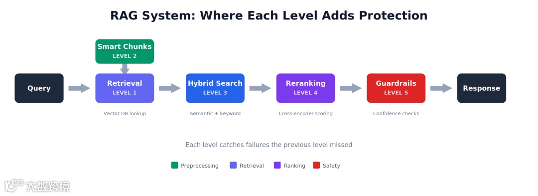 注意:重排救不了糟糕的初检。如果正确的 chunk 根本不在 20 个候选里,重排也浮不出来。先把等级 2 和 3 做好。