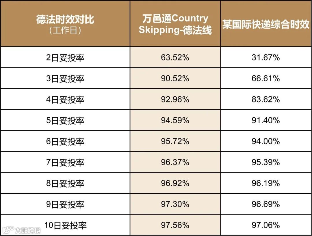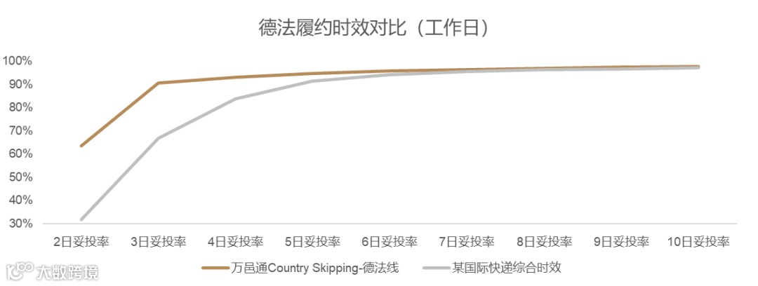 在德国至法国同样邮编范围前提下,对比某国际快递服务:万邑通Country Skipping-德法线妥投率一路领先。其3日妥投率就已突破90%,远高于某国际快递服务66%的3日妥投率,时效优势显著。