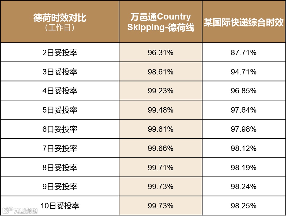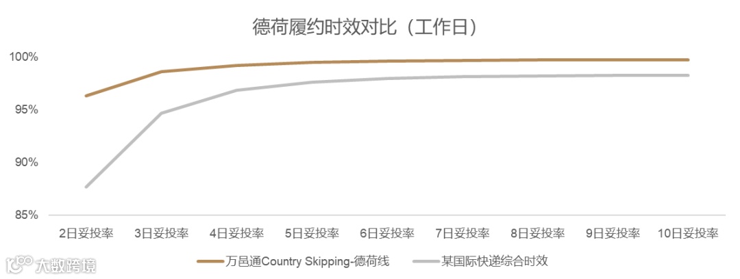 在测试阶段,万邑通Country Skipping-德荷线的时效表现同样优异。对比某国际快递服务,万邑通德荷线从2日妥投率至10日妥投率区间展现出绝对的领先性。其中,3日妥投率高达98%,而某国际快递服务的3日妥投率尚低于95%。