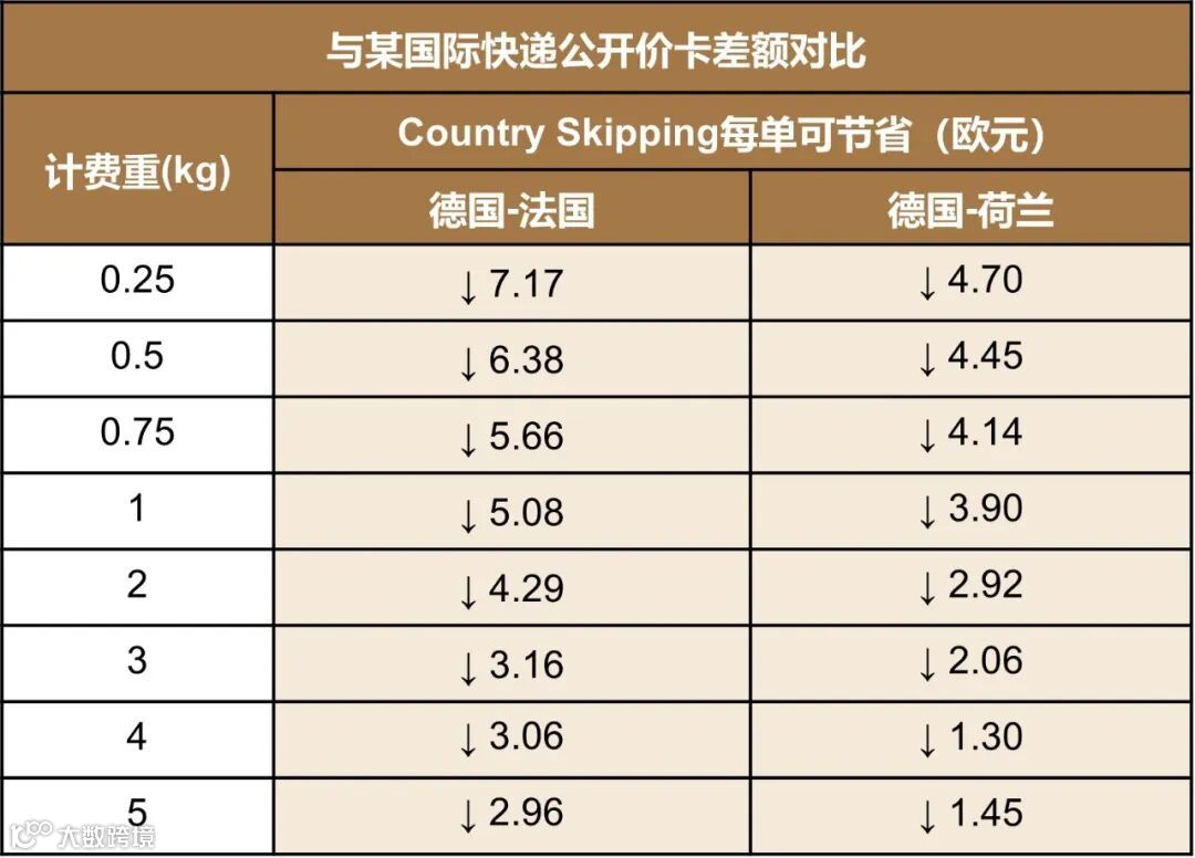 对比某国际快递公开价卡,万邑通欧洲Country Skipping-德法线在0.25kg至3kg计费重段单票可节省3-7欧;万邑通欧洲Country Skipping-德荷线在0.25kg至5kg计费重段同样全面占优。