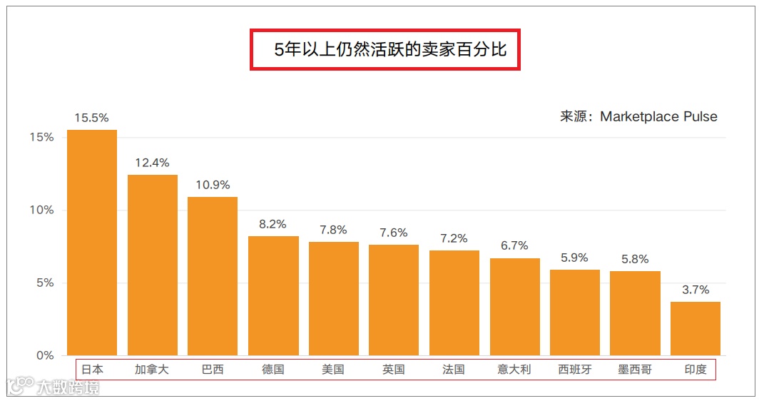 据观察,仅2026年一季度,已出现至少4位运营超5年的资深卖家宣布退出。结合卖家精灵《亚马逊2025年数据报告》核心数据:美国站运营满5年且仍保持活跃的卖家占比仅为7.6%;活跃率最高的日本站为15.5%;十大站点五年活跃率均值约9.1%。