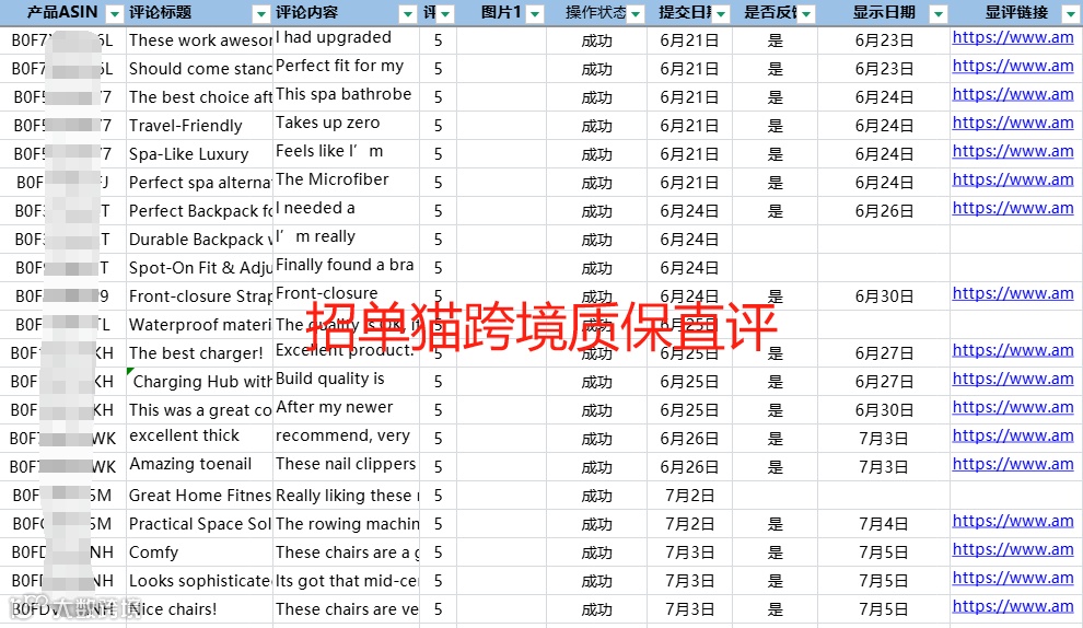 招单猫跨境的质保直评,支持美国、加拿大、英国、德国、法国、意大利、西班牙等多个站点,上评时效快,最快2天就可以显示评论,而且评论很稳定,可以长时间保持!