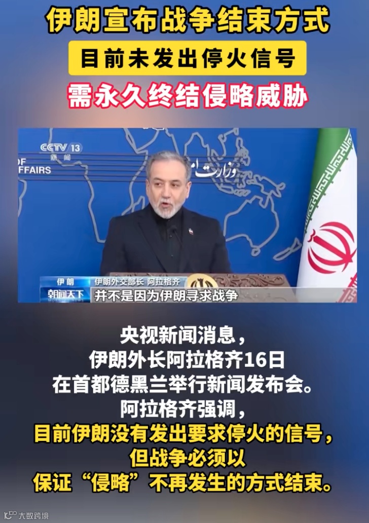 央视新闻消息,伊朗外长阿拉格齐16日在首都德黑兰举行新闻发布会。阿拉格齐强调,目前伊朗没有发出要求停火的信号,但战争必须以保证“侵略”不再发生的方式结束。