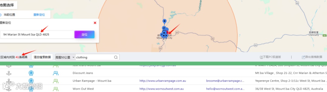 锁定目标客户后,可将其地址(如:94 Marian St, Mount Isa, QLD 4825)导入地图工具进行地理围栏式搜索,快速定位其周边同类企业。