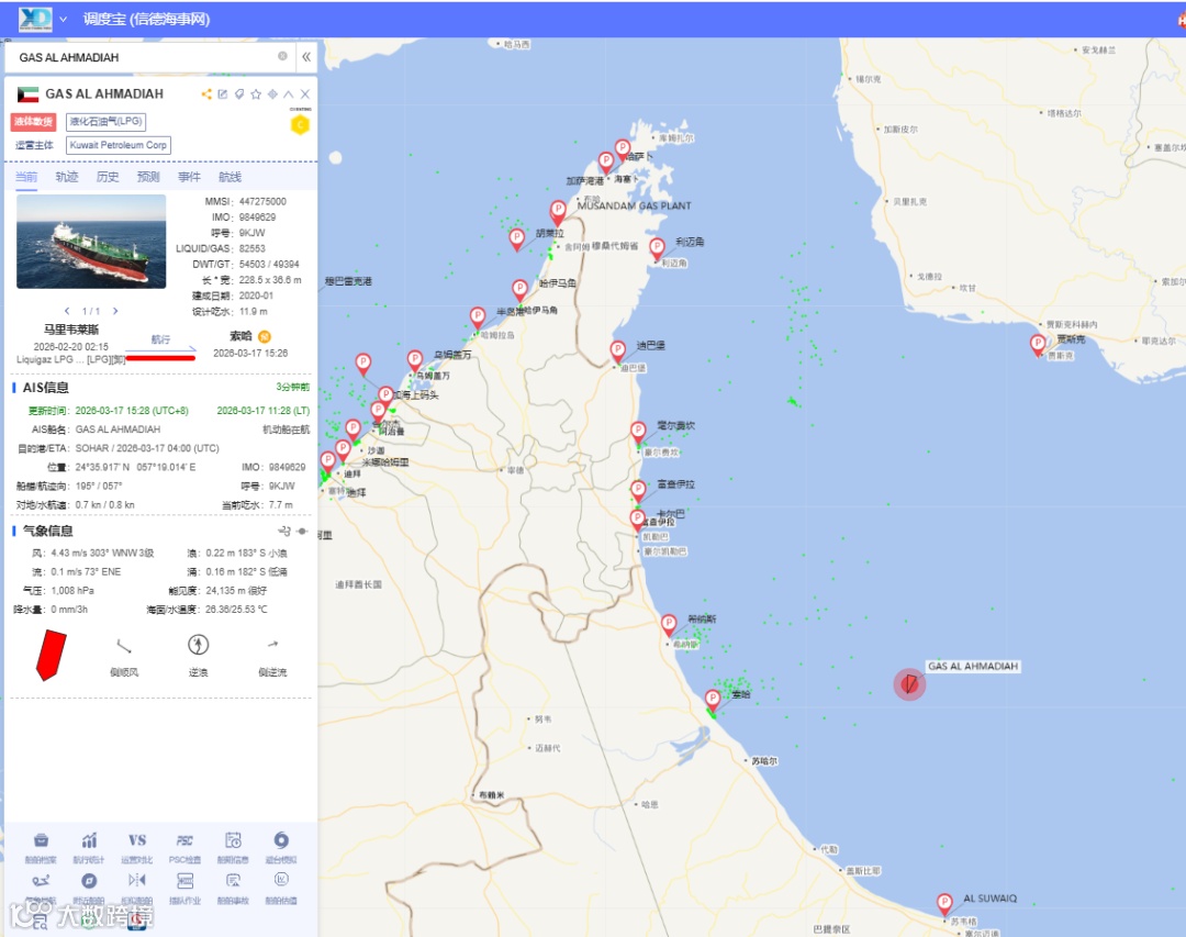 英国海事贸易行动办公室(UKMTO)通报称,一艘悬挂科威特船旗的LPG运输船“GAS AL AHMADIAH”在阿联酋富查伊拉以东约23海里锚泊时遭不明投射物袭击。该轮IMO号为9849629,载重吨54,503吨,2020年由韩国现代重工建造,由科威特石油公司体系内Kuwait Oil Tanker Co SAK运营,属科威特国家能源运输核心运力。