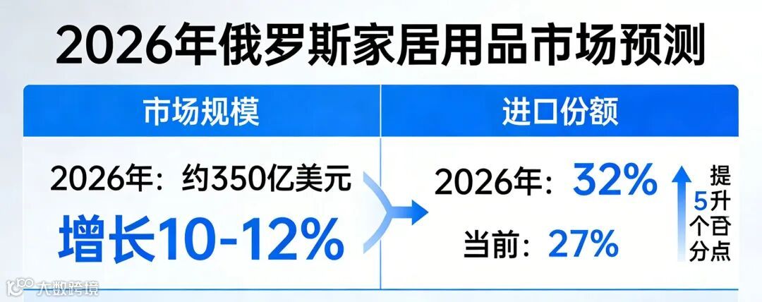 据俄罗斯联邦统计局及行业机构预测,2026年俄罗斯家居用品市场规模将增长10–12%,达约350亿美元;进口份额预计由27%提升至32%,对应**112亿美元进口空间**。