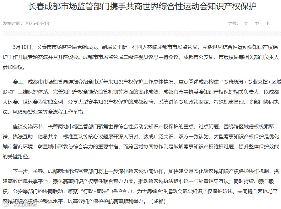 长春成都市场监管部门携手共商世界综合性运动会知识产权保护