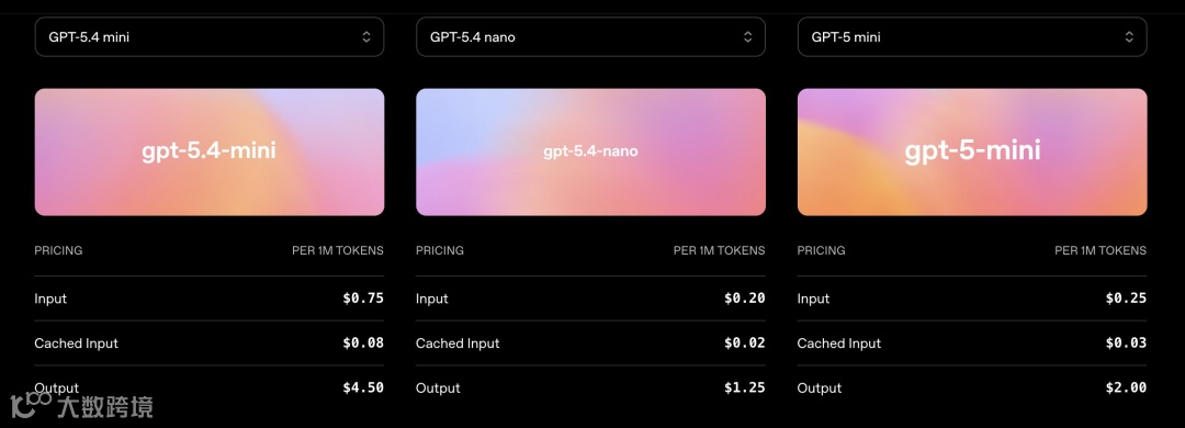 - GPT-5.4 nano仅限API调用:输入0.20美元/百万Token,输出1.25美元/百万Token,约为mini输入价格的1/4、输出价格的1/3,适用于分类、排序、结构化提取等低复杂度高频任务;