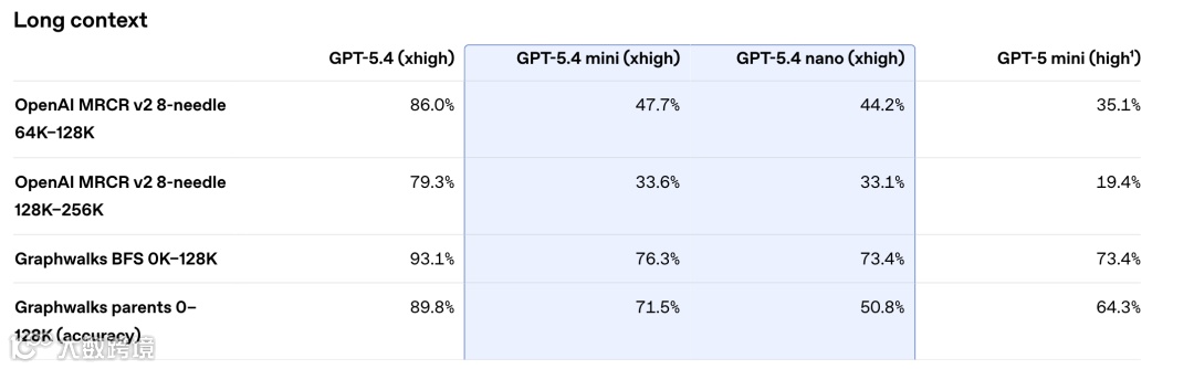 - 128K–256K窗口下:GPT-5.4 79.3%,mini为33.6%;