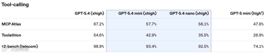 - τ2-bench(电信行业专用):mini达93.4%,逼近GPT-5.4(98.9%),大幅领先上一代(74.1%);