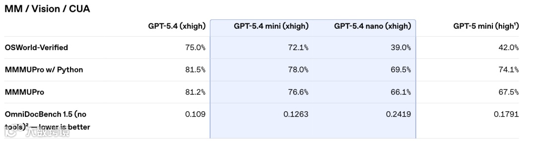 - GPT-5.4 nano得分为39.0%,略低于上一代mini,显示视觉推理存在明显能力断层;