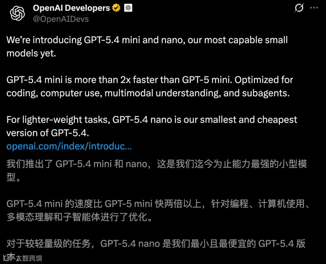 OpenAI悄然上线GPT-5.4 mini与GPT-5.4 nano——无预热、无倒计时,直接面向开发者开放。