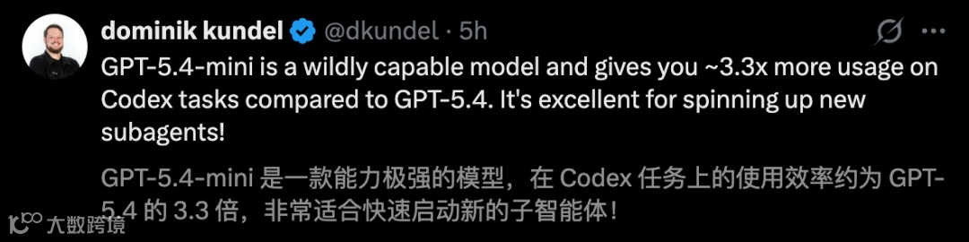 - Codex已落地该架构:GPT-5.4制定方案,自动调度mini执行,且mini消耗配额仅为GPT-5.4的30%;