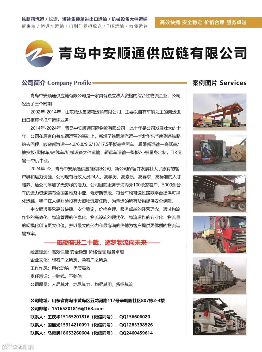 - 2024年至今:正式更名为青岛中安顺通供应链有限公司,持续整合优化客户资源与运力网络。现拥有行政及专业人员24人,全员高学历、高素质、高标准;服务海内外客户超100家,整合社会运力达5000余台,覆盖全国及中亚、俄罗斯等地区;所有车辆接入路歌平台,实现全程可视化运输追踪;承运货物均投保中国人民财产保险股份有限公司高额物流责任险,保障全程安全。