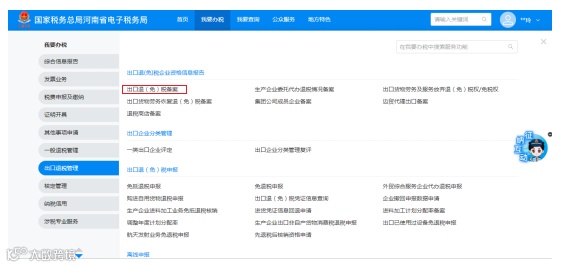 1.登录新电子税局后,点击【我要办税】-【出口退税管理】-【出口退(免)税企业资格信息报告】-【出口退(免)税备案】功能菜单。