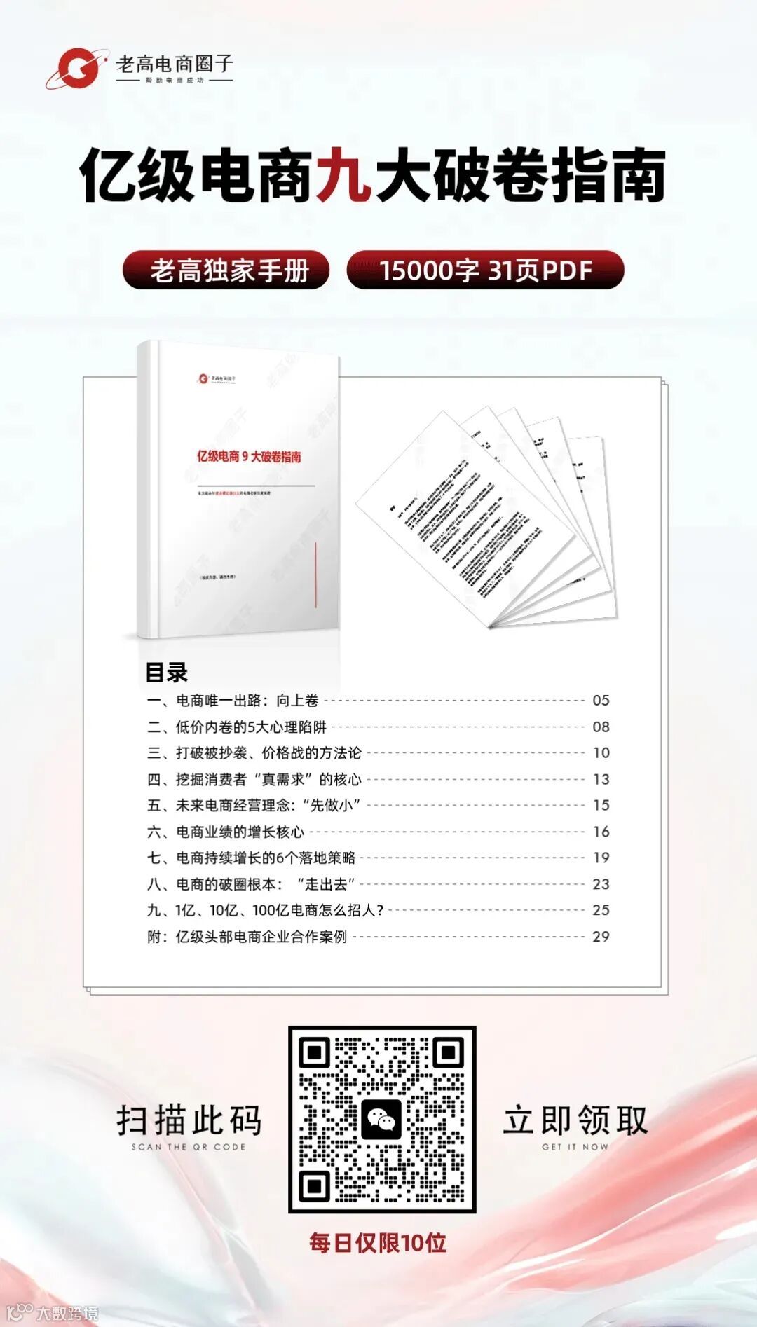 欢迎亿级电商老板扫码添加微信,备注“职位+营业额”,领取《亿级电商9大破卷指南(实战版)》。