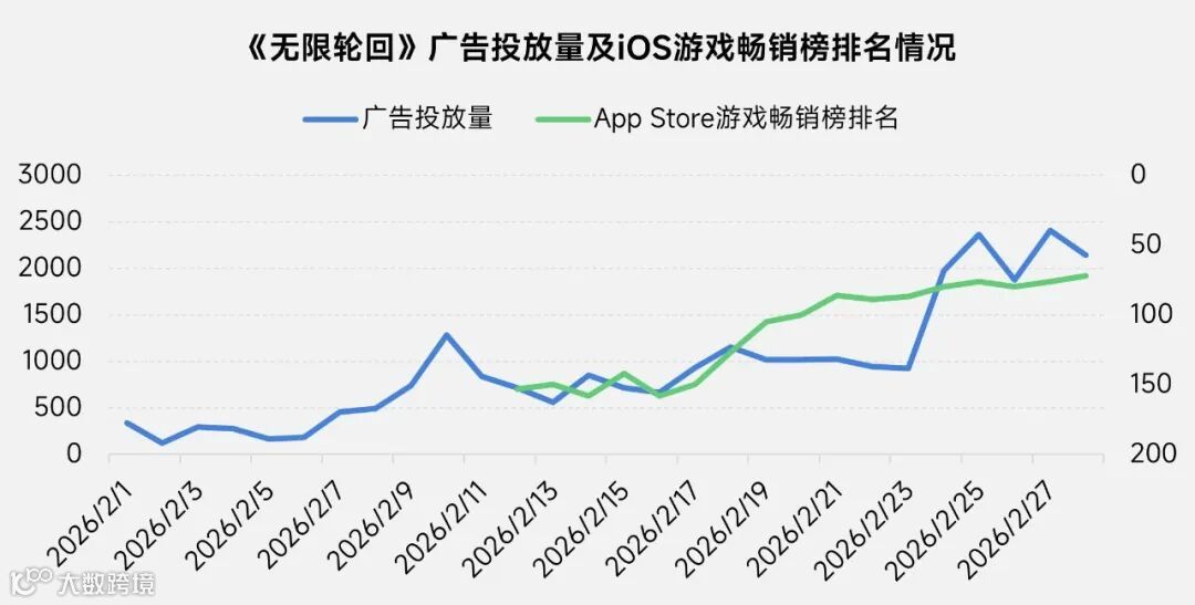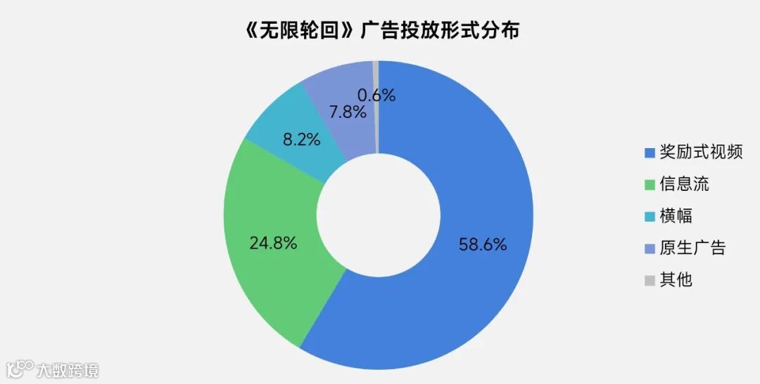 2026年2月《无限轮回》游戏广告投放量整体呈上升趋势,其在iOS游戏畅销榜排名亦逐渐升高。从投放的广告形式来看,奖励式视频是主要形式,占统计日期内广告投放量的58.6%,另外,信息流、横幅及原生广告分别占24.8%、8.2%及7.8%。