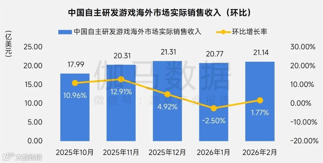 2026年2月,中国自主研发游戏在海外市场的实际销售收入达到21.14亿美元,环比增长1.77%,同比增长40.46%。