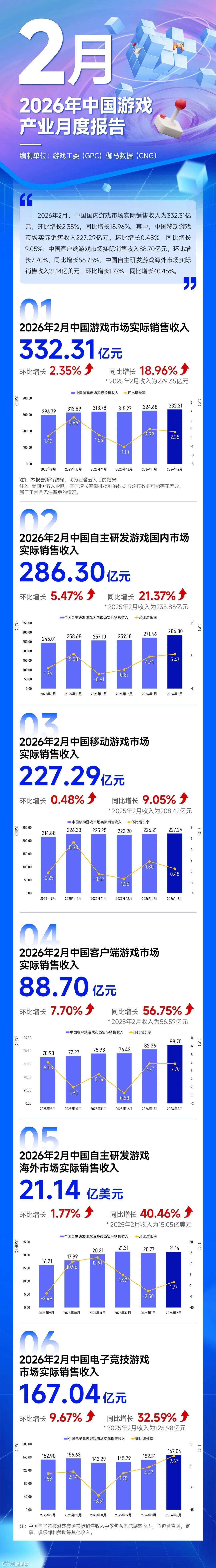 2026年2月,中国国内游戏市场实际销售收入为332.31亿元,环比增长2.35%,同比增长18.96%。同比增速创近10个月新高。