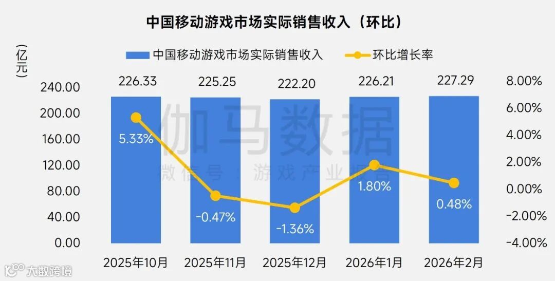 2026年2月,中国移动游戏市场实际销售收入达227.29亿元,环比增长0.48%,同比增长9.05%。
