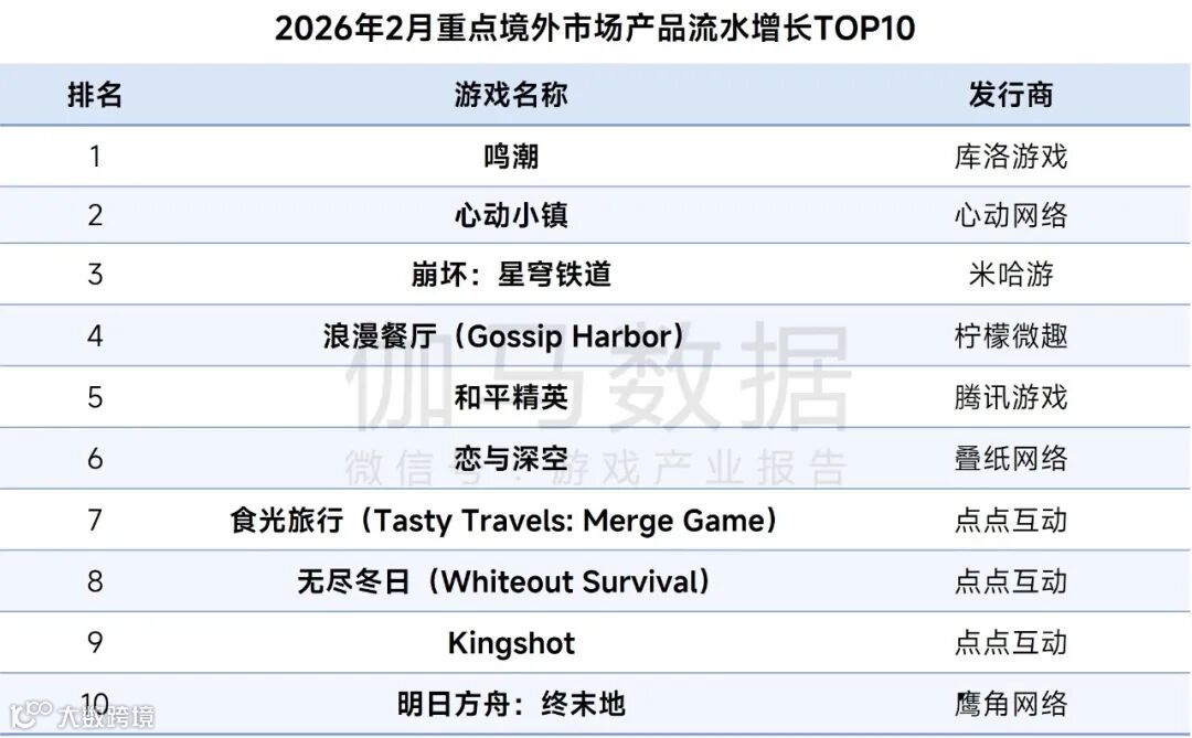 2026年2月重点境外市场产品流水增长TOP10中,《鸣潮》位列榜首,《心动小镇》《崩坏:星穹铁道》同样进入TOP3。