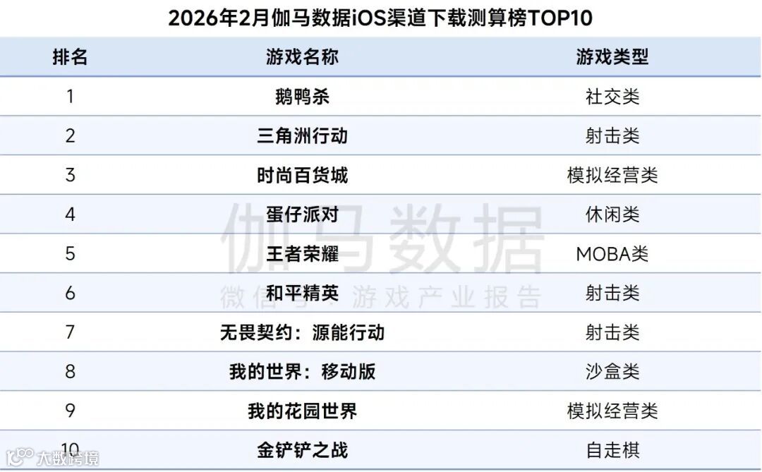 2026年2月伽马数据iOS渠道下载测算榜TOP10中,《鹅鸭杀》蝉联榜首,上月新品《时尚百货城》进入TOP3。