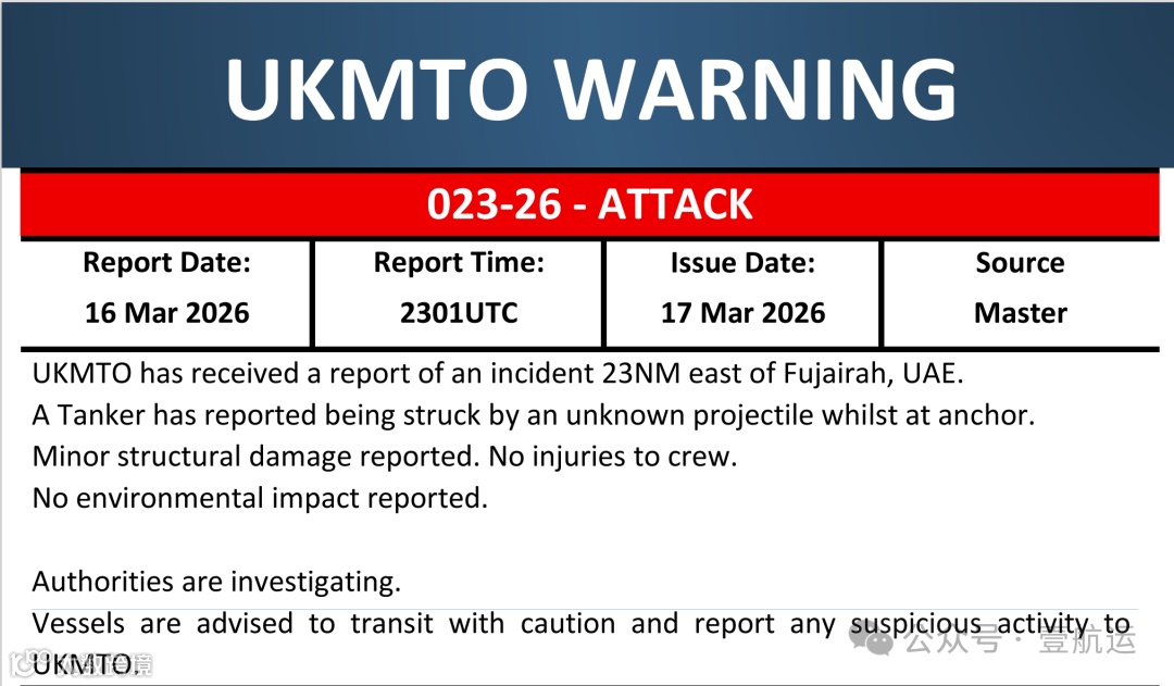 据英国海上贸易行动办公室(UK Maritime Trade Operations,UKMTO)最新通报,北京时间3月17日7时许,在阿联酋富查伊拉港(Fujairah)以东约23海里海域,一艘油轮在锚泊期间遭不明物体袭击,造成船体轻微结构性损伤。