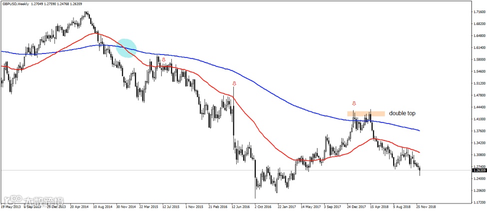 如上图,英镑/美元周线图中,红色线为50SMA,蓝色线为200SMA,50SMA下穿200SMA验证了趋势下跌,是看空机会。