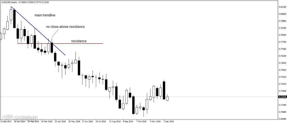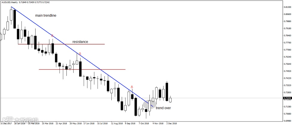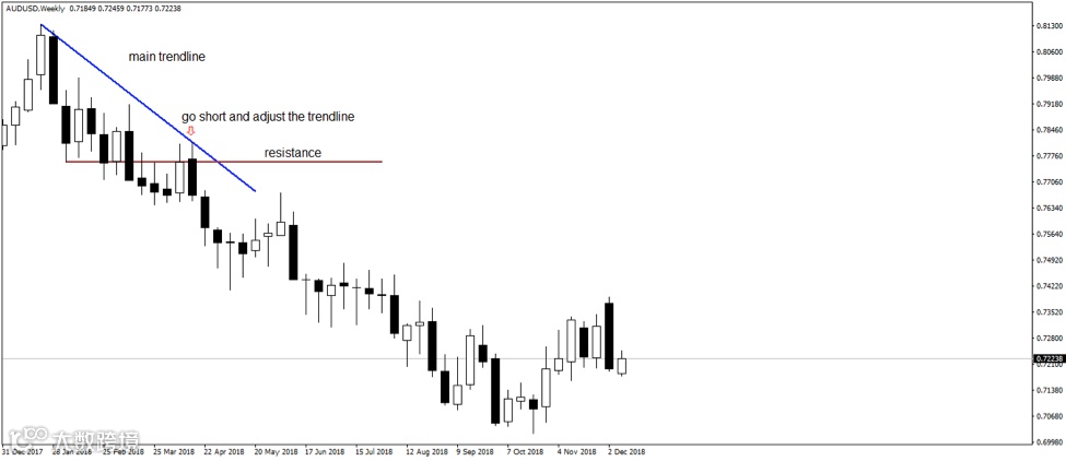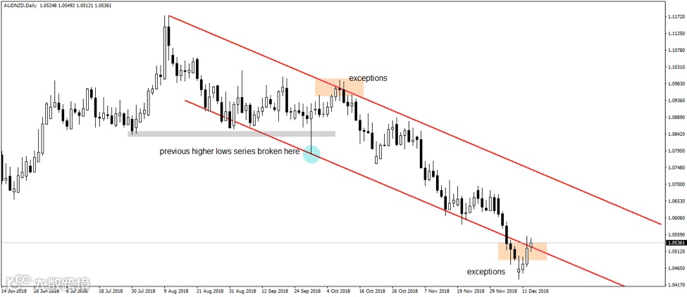 比如下方的澳元/美元日线图,连接对应高点和低点,形成了明显的下跌通道。价格突破前期的阻力水平,证实了下跌趋势。
