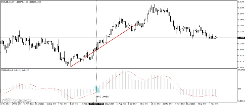 实际上可以借助趋势线,在看涨趋势中,将前期价格低点和MACD线与0线的交叉点对应位置的K线相连,并且将趋势线延长。可以看到上涨趋势早已开始。