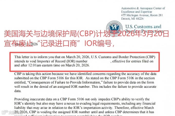 近日,美国海关和边境保护局(CBP)发出正式通知信函,通知部分进口商记录号(Importer of Record, IOR)将在 2026 年 3 月 20 日 起被作废。