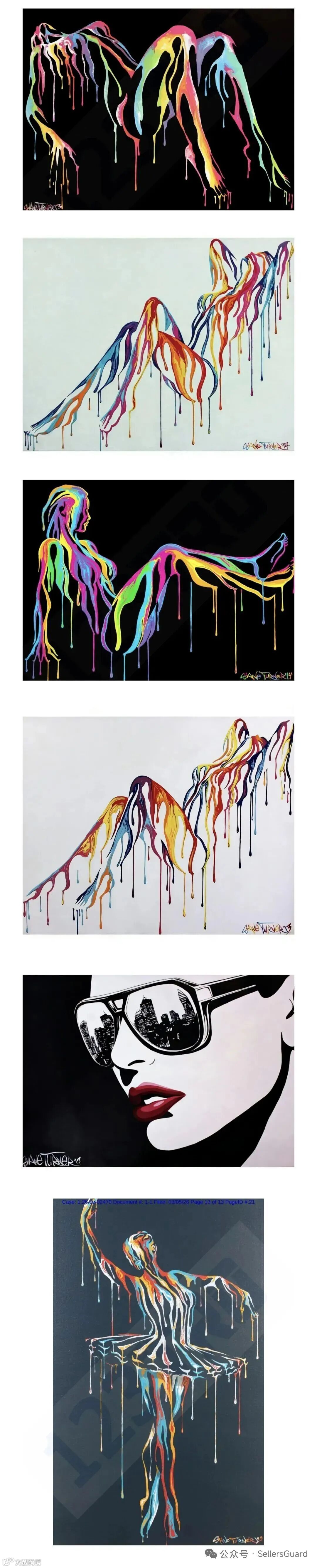 该案件为近期新发版权维权案,涉及高辨识度艺术作品,对跨境电商(尤其亚马逊平台)卖家风险较高。 建议立即排查店铺内是否使用含 “流体 / 滴落效果” 的女性形象插画,含标题、主图、详情页及包装素材,即刻下架并替换自有版权内容。